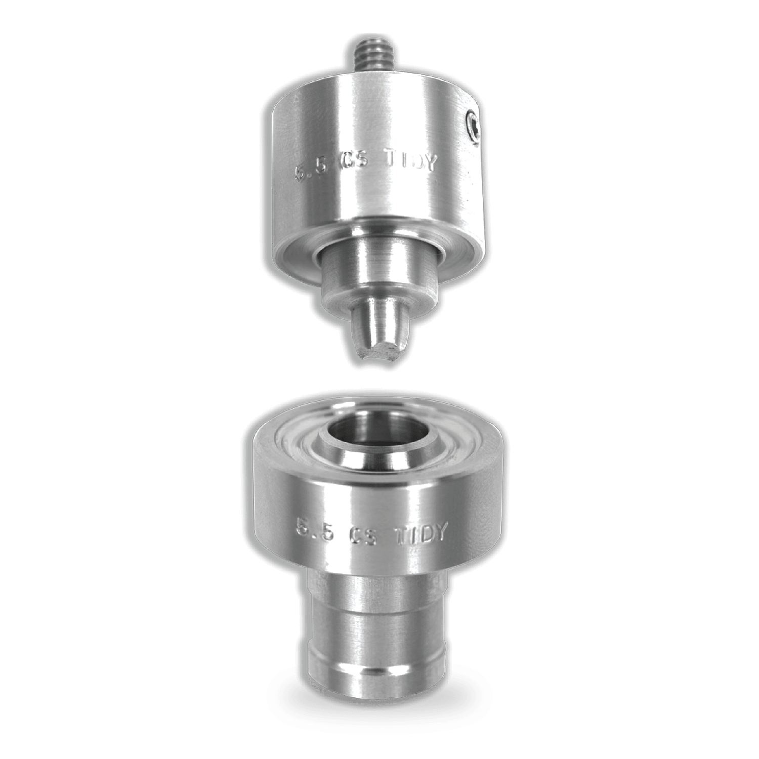 The proprietary grommet dies are made from professional grade stainless steel in grommet sizes #1, #2, #3, #4, #5 and #5.5 to be used with non-rusting self-piercing grommets with hole sizes 5/16, 3/8, 7/16, 1/2, 5/8 & 11/16 ID. Self-cleaning grommet dies from ClipsShop are compatible with the CS-TIDY-41 and CS-TIDY-51 professional-grade portable pneumatic grommet machines.
