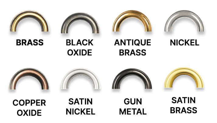 • Brass   • Nickel   • Chemical black oxide   • Antique brass   • Satin brass   • Satin nickel  • Gun metal   • White paint   • Copper oxide